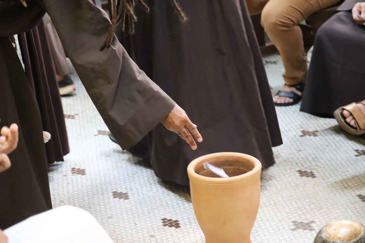 O dia, contudo, começou com a Oração da Manhã, com o tema “Cristo, única fonte de misericórdia”: “Irmãos, hoje é tempo de pedir perdão ao Senhor pelas vezes que, através das nossas ações, ferimos de várias maneiras o carisma franciscano e, neste caso, o próprio Senhor”, rezaram. Esse gesto foi feito pelos frades escrevendo num pedaço de papel quando não foram fiéis ao que prometeram a Deus. No centro da capela, ao lado quadro da Regra de Vida dos Frades Menores, uma imagem de São Francisco e uma vela acesa, foi colocado um vaso para depositar o papel queimado com o que estava escrito.