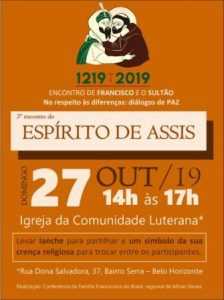 É com muita alegria que a Conferência da Família Franciscana de Minas Gerais, em sintonia com líderes religiosos de diferentes expressões de fé convidam os irmãos e irmãs para celebrar os 800 anos do encontro entre Francisco de Assis e o Sultão Al-Kamil. Nosso desejo é: no respeito às diferenças, construir diálogos de Paz.