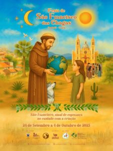 O cartaz da festa, assinado por Rogério Sales, traz cores vibrantes e elemento que remetem ao jubileu franciscano celebrado em 2025. No centro, a imagem de São Francisco aparece segurando o globo terrestre ao lado de uma criança, símbolo da esperança. Ao redor, elementos da criação típicos do sertão cearense, com destaque para a vegetação regional.