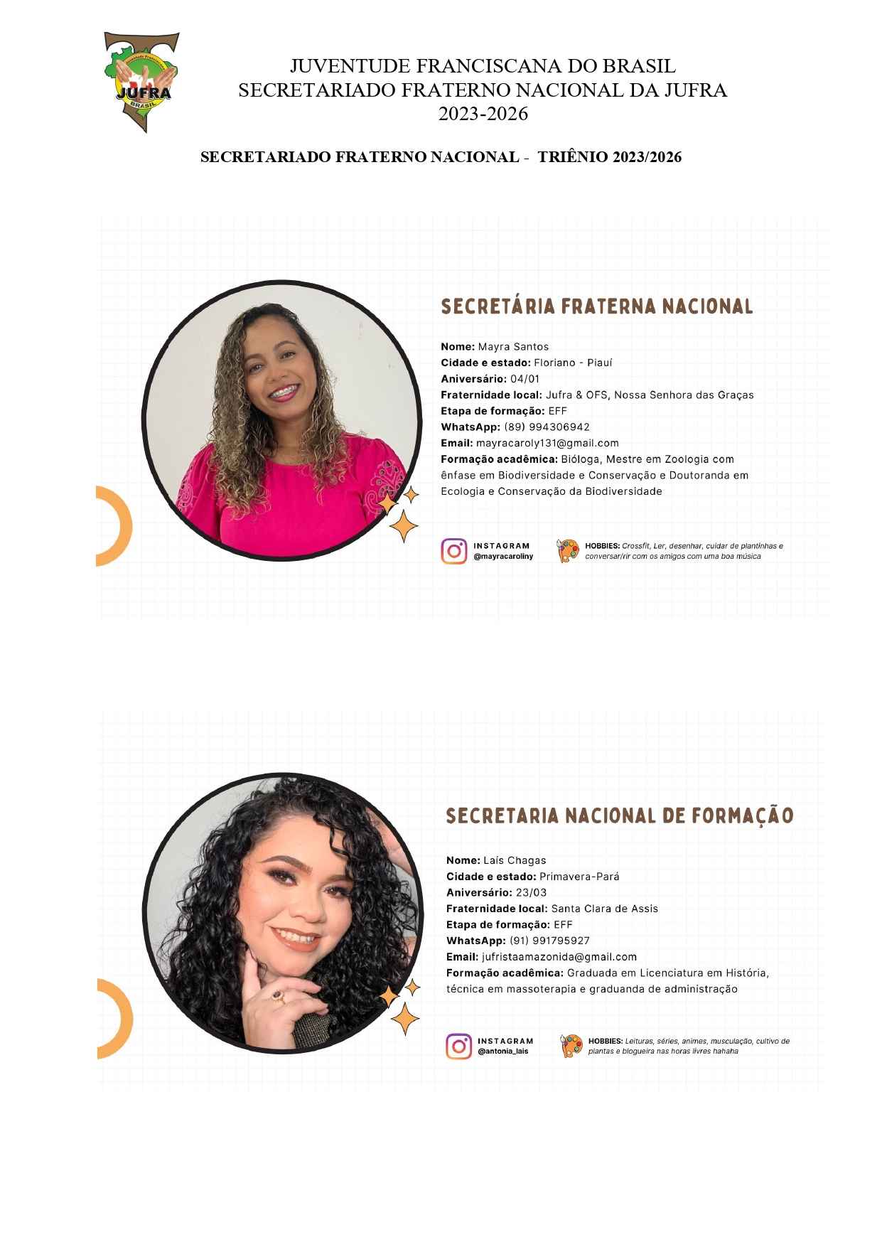 É com muito entusiasmo e alegria que venho, através desta carta e anexos, apresentar a equipe de jufristas (eleitas/os e convidadas/os) para compor o novo Secretariado Fraterno Nacional da Juventude Franciscana do Brasil (JUFRA), triênio 2023 a 2026, com exceção do Colegiado da Animação Fraterna eAssistência completa, que serão anunciados em breve. Bem como, apresentar-me oficialmente comoSecretária Fraterna Nacional da JUFRA.