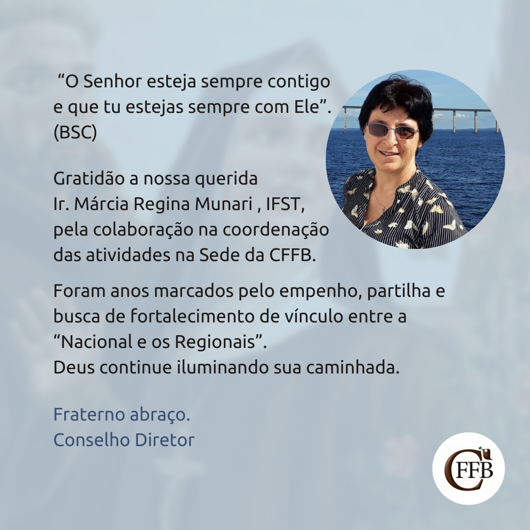No mês de junho, encerrou-se um novo ciclo na CFFB. A Irmã Márcia Regina Munari, IFST, que esteve à frente da coordenação das atividades na Sede, despede-se desta função. Foram anos marcados pelo empenho, partilha e busca de fortalecimento de vínculo entre a “Nacional e os Regionais”. Nosso agradecimento especial à Congregação das Irmãs Franciscanas da Santíssima Trindade, pela colaboração nos últimos três anos e à Irmã Márcia Regina Munari, pela eficiente doação e dedicação durante este período de serviço.