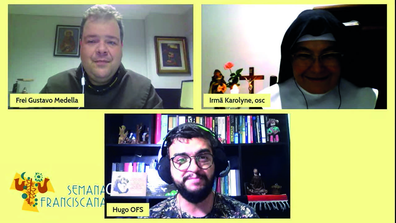 Os três ramos da Ordem Franciscana – os Frades Menores, as Irmãs Clarissas e os leigos – estiveram juntos para “uma conversa em família”, como disse o Vigário Provincial da Província da Imaculada Conceição, Frei Gustavo Medella, ao acolher a Irmã Maria Karolyne de Jesus Crucificado, Clarissa do Mosteiro Santa Clara, de Belo Horizonte, MG, e Hugo Leonardo Pereira Borba, Ministro da Fraternidade Santo Antônio dos Pobres da Ordem Franciscana Secular, em Volta Redonda, RJ, no encontro do segundo dia da Semana Franciscana que vai até o próximo sábado (09/10), numa promoção conjunta da Província Franciscana da Imaculada Conceição, da Conferência da Família Franciscana do Brasil, do Instituto Teológico Franciscano e da Editora Vozes, através de suas redes sociais.