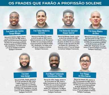 A Fundação Imaculada Mãe de Deus e a Província da Imaculada Conceição celebrarão, no dia 13 de novembro, o ingresso definitivo na Ordem dos Frades Menores de sete frades professos temporários: os jovens angolanos Frei André dos Santos Sungo Mingas, Frei Honorato Salvador Gaspar Gabriel, Frei José João Ganga e Frei Miguel Tchiteculo Tchindjombo Filipe, e os brasileiros Frei Felipe Medeiros Carretta, Frei Jonas Ribeiro da Silva e Frei Thiago da Silva Soares.