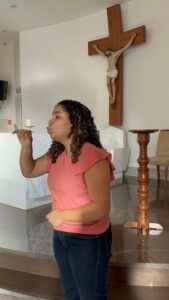 Entre as crianças e adolescentes instituídos, uma jovem surda oralizada da Comunidade Nossa Senhora Auxiliadora, Kalyla Santos Rodrigues, também foi instituída Coroinha. Ela participou dos encontros com a presença de um intérprete. E, no último dia de formação (11/05), ela deixou um bonito testemunho para todos os seus colegas: