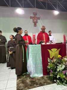 Em seguida, Frei Pedro abençoou as vestes próprias dos Coroinhas, sinal distintivo deste serviço. E os familiares e responsáveis os revestiram. Depois, receberam das mãos dos freis um Tau Franciscano, vindo da peregrinação de Frei Pedro a Assis.