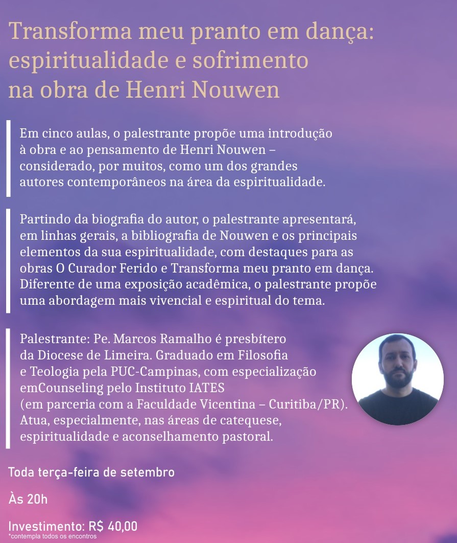 O curso propõe uma introdução à obra e ao pensamento de Henri Nouwen – considerado, por muitos, como um dos grandes autores contemporâneos na área da espiritualidade. Partindo da biografia do autor, o palestrante apresentará, em linhas gerais, a bibliografia de Nouwen e os principais elementos da sua espiritualidade, com destaques para as obras *O Curador Ferido* e *Transforma meu pranto em dança*. Diferente de uma exposição acadêmica, o palestrante propõe uma abordagem mais vivencial e espiritual do tema.