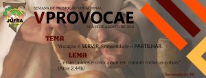Enriquecidos pela divina Ruah, nos alegramos com a chegada de mais uma Semana de Promoção Vocacional, a PROVOCAE. Nesta quinta edição, refletiremos o tema: Vocação é servir, Fraternidade é partilhar. E teremos como inspiração bíblica, o relato das primeiras comunidades: “… eram unidos e colocavam em comum todas as coisas.” (Atos 2,44b). Para uma sintonia maior de nossas atividades, nossa semana terá início no dia 11 e terminará no dia 19 de agosto. Assim, teremos dois pilares-modelos para nosso caminho e promoção vocacional, Santa Clara e Maria, celebrando a festa da sua assunção.
