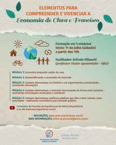 Essa proposta deu origem ao curso de formação online e gratuito “Elementos para entender e vivenciar a Economia de Clara e Francisco”, oferecido pelo Vicariato para Ação Social, Política e Ecumênica da Arquidiocese de Vitória, em parceria com o Coletivo Estudos de Conjuntura.